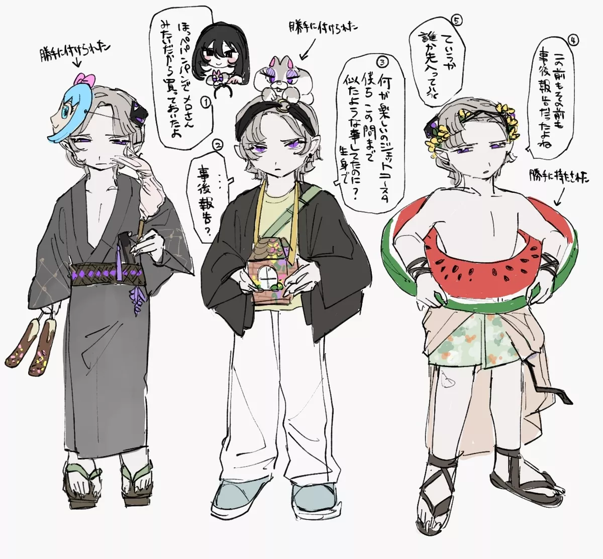ファッション・こだわり│ ゆったりした服が好き。(かっちりした服を着る気になれない) ぼんやりした色を着ているが、イエベ春。浴衣を着せると大変だらしない着こなしをする。