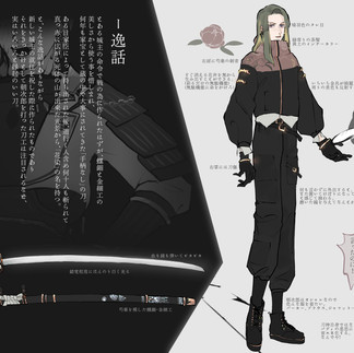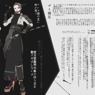 由来・つづり│ 花染朝次郎ハナゾメアサジロウ: 螺鈿が特徴なので海っぽい名前→浅次郎→デザイン変更のために(没は黒髪褐色肌)、海要素が皆無になったので「浅」から「朝」に。苗字には家紋の芍薬の花を入れた。